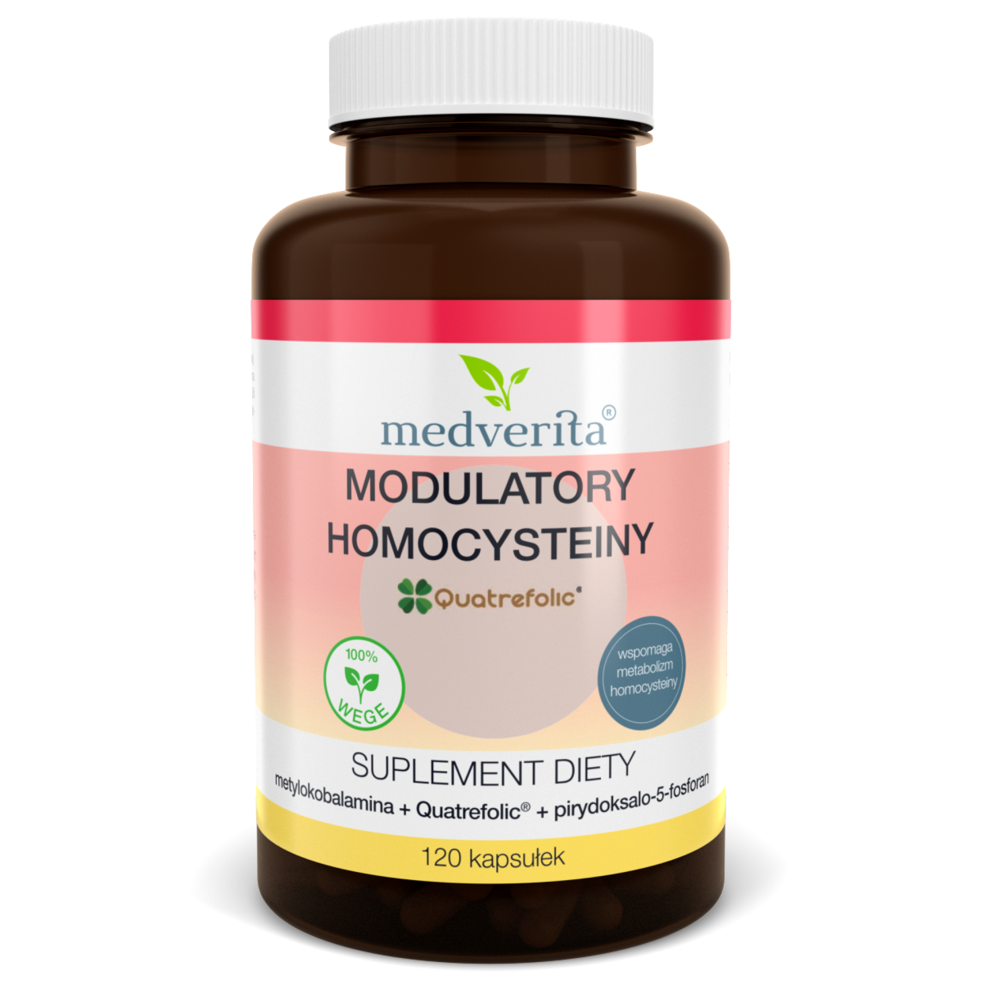 Modulatory homocysteiny Medverita to suplement diety w kapsułkach zawierający bioaktywne formy witamin: B6, B12, foliany, cholinę oraz bezwodną betainę. Produkt jest wzbogacony w glutation, N-acetylocysteinę, cynk, niacynę oraz ryboflawinę.